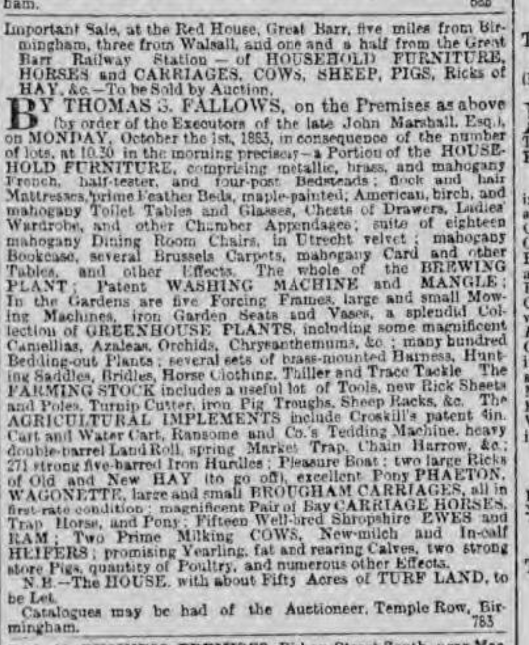 It would seem Charlotte continued to live at the Red House for another year as it was not until Monday October 1st 1883 that there was a sale of the contents of the house, there being auctioned off 'on the orders of the Executors of the late John Marshall'.